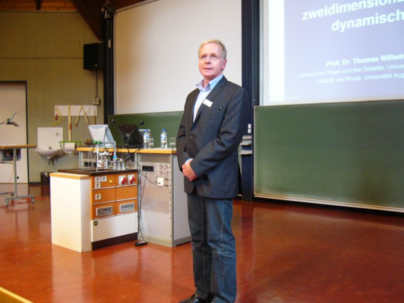 Dr. Thomas Wilhelm (Universität Augsburg) informierte in seinem Vortrag zunächst über weit verbreitete Schülervorstellungen zu Begriffen der Mechanik und stellte darauf einen neuen Mechaniklehrgang für Klasse 7 vor, bei dem von Anfang an zweidimensionale Bewegungen betachtet werden. Vor allem ging er dabei auf Möglichkeiten der Erfassung und Analyse von Bewegungen ein und demonstrierte somit die Vielfältigkeit und Praxistauglichkeit der Materialien, die für den Unterricht bereitgestellt werden. Abschließend stellte er die überaus ermutigenden Ergebnisse einer größeren Evaluationsstudie vor.
